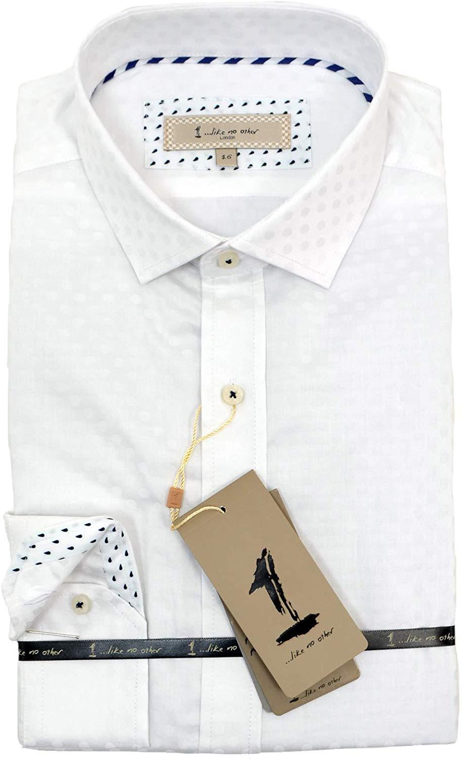 Classic White formal shirt elevated with woven polka dot pattern. Contrasting Navy dot trim in the cuffs, and inside placket edge. Individually numbered and limited to 500 pieces.